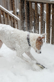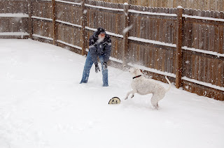 Today it has been snowing…and snowing…and snowing. I think we are around 6 inches and it is still coming down. SAS in closed so Kevin, Jack and I are hanging out watching the Inauguration. The most fun of today is Jack’s first big snow. We have had dusting before and he has slipped around a bit…but this is so much funnier. Since it is pretty windy, the snow kinda built up against the back door, so when I opened it, he was confused. He was starring at it and kind play bowed to it and then ran to the front door like “Isn’t there another option?” I was laughing so hard and called Kevin to come downstairs and we coaxed him out in the yard. He proceeded to pee and then frantically run around the yard. It was so funny! Anyway, we went out and played with him a few hours ago and had some fun time. He would go to bite the frisbee in the snow and then get it in his nose and whiskers and sneeze :). I got some shots. I uploaded a lot more onto Facebook if you want to check them out…most of you guys have that.
